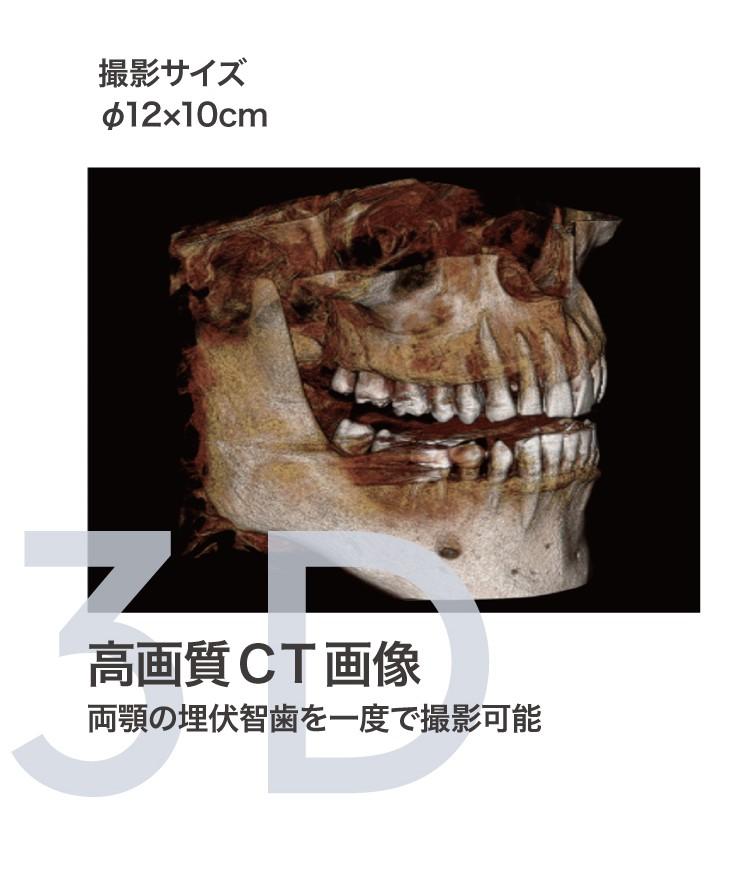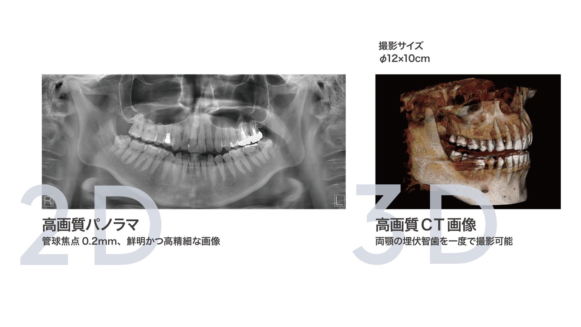 撮影範囲はΦ12×10とΦ8×10の2種類。Φ12×10では両顎の埋伏智歯も一度で撮影でき、患者様への負担を軽減します。さらに、Φ8×10ではより高精細な画像を得ることができ、幅広い診療ニーズに対応可能です。